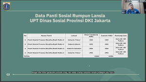 Dr. drg. Maria Margaretha, M.Si., FISQua selaku Kepala Bidang Rehabilitasi Sosial, Dinas Sosial Provinsi DKI Jakarta, menjadi pemateri ketiga yang memaparkan bahwa dukungan sosial dan komunitas terbukti krusial dalam meningkatkan kualitas hidup lansia. Adapun DKI Jakarta mewujudkan dukungan tersebut melalui layanan panti dan bantuan di luar panti.