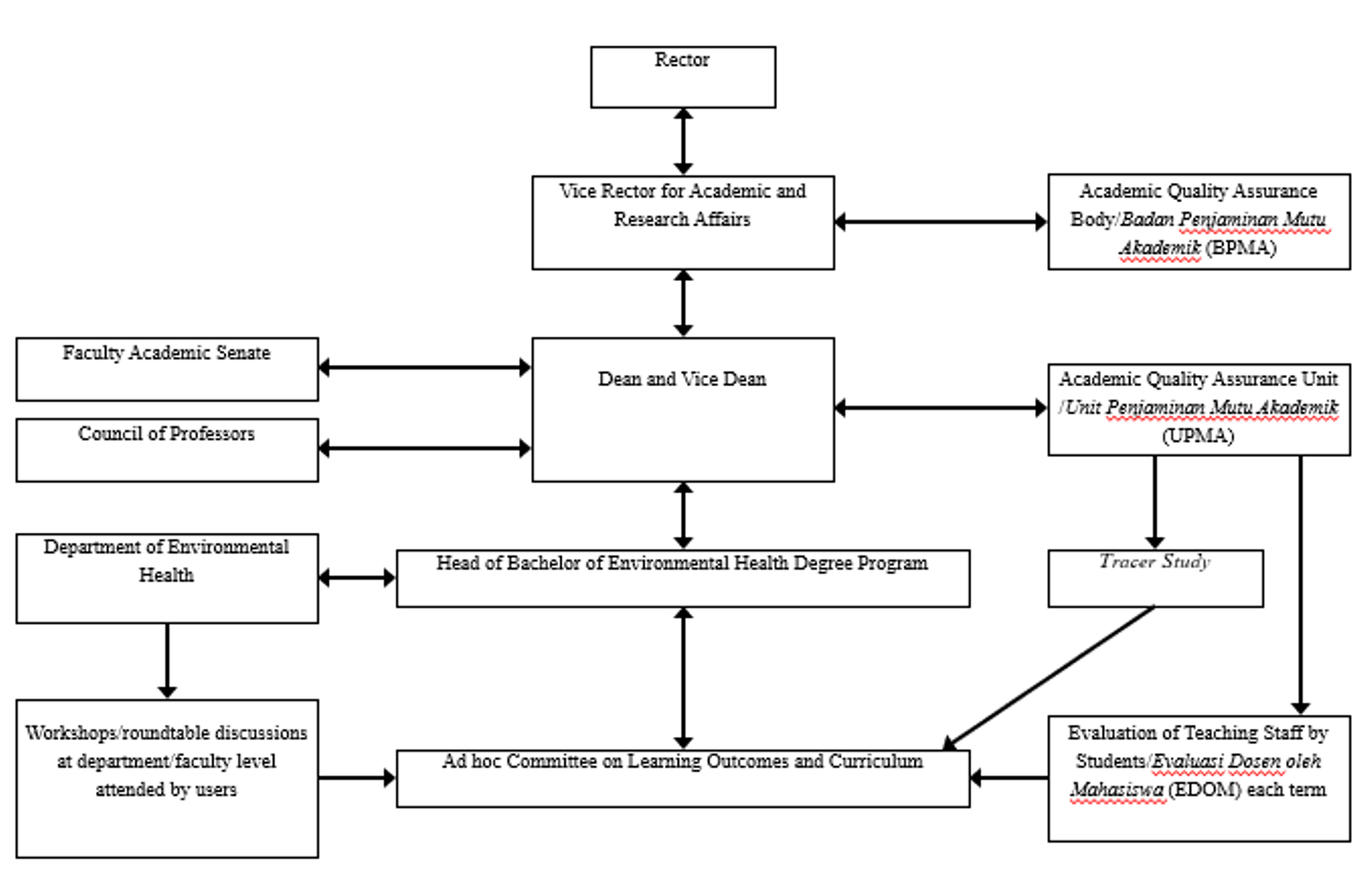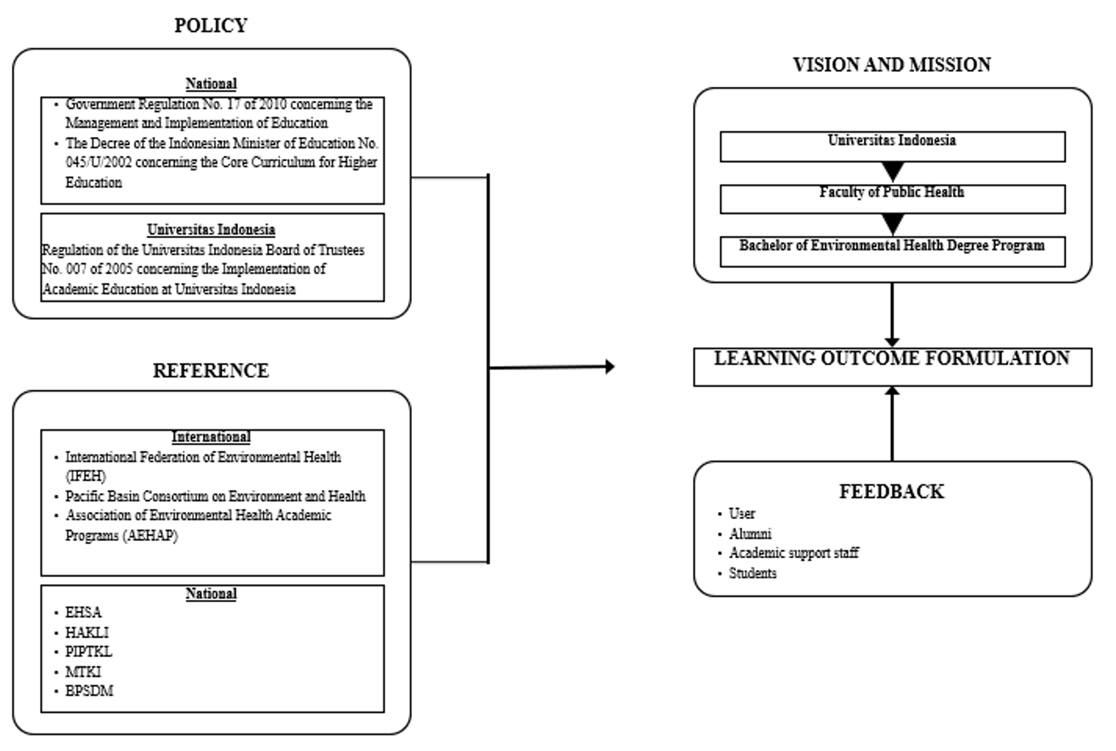 In the process of preparing the curriculum document, the needs and policy analyses, benchmarking with various environmental health studies programs at renowned universities abroad, formulating learning outcomes with environmental health professional organizations such as Environmental Health Specialist Association (EHSA) and the Indonesian Association of Environmental Health Experts (Himpunan Ahli Kesehatan Lingkungan Indonesia/HAKLI) and with the Association of Higher Education Institutions for Environmental Health (Perkumpulan Institusi Pendidikan Tinggi Kesehatan Lingkungan/PIPTKL) were carried out. Furthermore, in developing learning outcomes and curriculum, the Bachelor of Environmental Health Degree Program at UI involved stakeholders comprising lecturers, students, alumni, and users. The stakeholder involvement in developing learning outcomes and curriculum can be seen in the following figure: