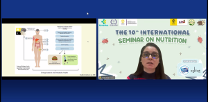 Seminar menghadirkan Dr. Satvinder Kaur Nachatar Singh, Associate Professor, Faculty of Applied Sciences, UCSI University, Malaysia sebagai narasumber pertama yang membahas konsep Chrononutrition, yaitu ilmu yang mempelajari hubungan antara waktu makan dan ritme sirkadian (jam biologis) tubuh dalam tajuk “Protein Timing: Does It Really Matter for Active Lifestyle?”. Terdapat tiga hal yang diterangkan oleh Dr. Satvinder, yakni mengenai ritme sirkadian, protein timing untuk otot, serta strategi sederhana yang dapat diterapkan. Dijelaskan bahwasannya waktu dalam mengonsumsi protein sama pentingnya dengan jumlah yang dimakan. “Setiap organ, termasuk otot, memiliki jam biologis. Otot lebih efisien dalam menyerap asam amino dan membangun jaringan di pagi hari. Tentunya, mengonsumsi protein di pagi hari membantu mengoptimalkan Muscle Protein Synthesis (pembentukan otot) yang sangat penting bagi individu untuk aktif, terutama bagi lansia untuk mencegah sarkopenia (hilangnya massa otot),” tutur Dr. Satvinder.