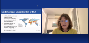 Pembicara kedua Kristen Marie Hurley, Ph.D., M.P.H., Associate Professor Program for Human Nutrition, Johns Hopkins Bloomberg School of Public Health mempresentasikan masalah gizi paling serius, yakni Protein-Energy Malnutrition (PEM) atau Kekurangan Energi Protein (KEP). PEM menjadi ancaman kesehatan pada anak-anak yang disebabkan oleh kekurangan protein dan kalori, serta sering disertai defisiensi mikronutrien. Kondisi tersebut muncul dalam berbagai bentuk, yakni stunting: gizi kurang kronis, wasting: gizi kurang akut, serta marasmus dan kwashiorkor sebagai bentuk malnutrisi akut berat (Severe Acute Malnutrition/SAM).